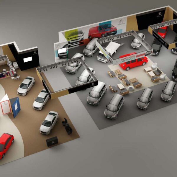 Podział dostępnych stref o powierzchni ponad 900m2, na strefę samochodów osobowych i dostawczych, z wyróżnieniem nowości produktowych. Ekspozycja ponad 20 samochodów.