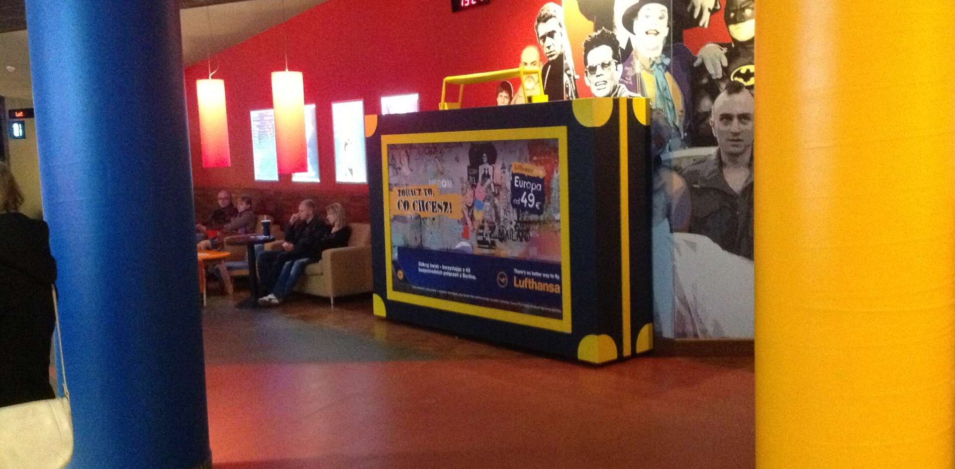Kampania realizowana była w 15 kinach Cinema City w zachodniej Polsce, działania dotyczyły emisji 10 sekundowych spotów oraz samplingu 60 000 pocztówek przez kasjerów. W 4 lokalizacjach pojawiła się ambientowa walizka Lufthansy promująca ofertę przewoźnika o wymiarach 2 x 3 m.